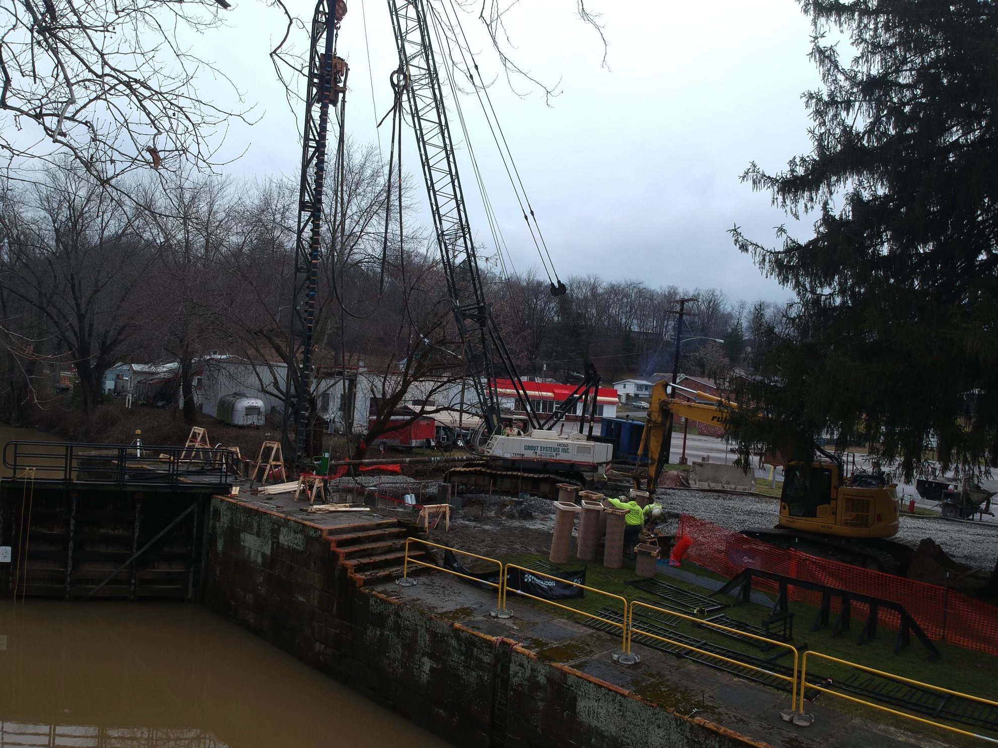 Grout Systems was first contracted to design and install a working platform on the “land side” of the lock. The reason for this was: for fear of the equipment loads working in close proximity of the aged structure; which was already experiencing significant settlement of the earth there. We designed an Auger Cast Pile grid system consisting of 12-rows of 3-piles each. Beams were installed on the tops of these pile perpendicular to the lock. The piles nearest to the lock worked in compression while the far piles were suited with all thread reinforcing to accomplish the tension loads required. Significant bracing was required in the framing due to piles being extended above the grounds surface up to 7’-0”. The equipment it was designed for would cause lateral loads as it moved about the platform. The beams were then covered with 1’-0” x 4’-0” x 24’0” wooden crane mats that became our working surface. Portions of the platform were designed to extend over portions of the lock. This would allow Grout Systems access to the next portion of our work. The Auger Cast Pile grid system was also very beneficial in the stabilization of the earth behind the Lock wall. Voids were filled throughout the installation and the compression of the loose soil took place.