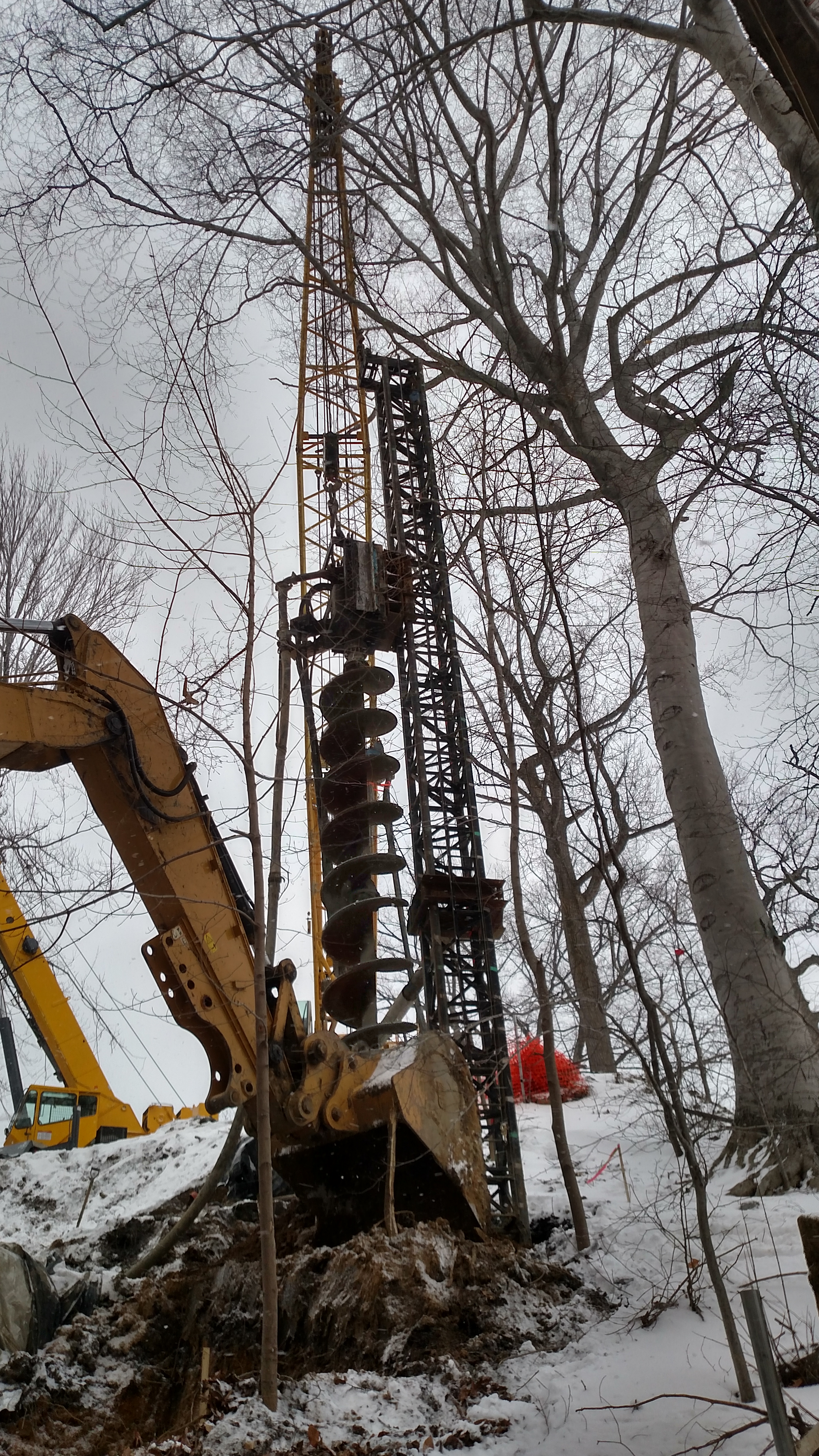 The Wildlife Center was constructed on approximately 2 acres of land covered with mature Oak, Maple, and Beech trees. The top of pile elevations varied 36’ along the site. Due to difficult access conditions, the project required a special low headroom rig and a large crane with swinging leads to reach the piles. The large crane was used to reach pile locations up to 70’ away. We took great care not to disturb existing root systems and tree tops above. Through strategic planning, our crane worked above, below and sometimes in the existing canopy with very minimal contact. The majority of all the piles were installed with the crane and live leads. A low headroom rig was then mobilized to drill the remaining piles that could not be reached.